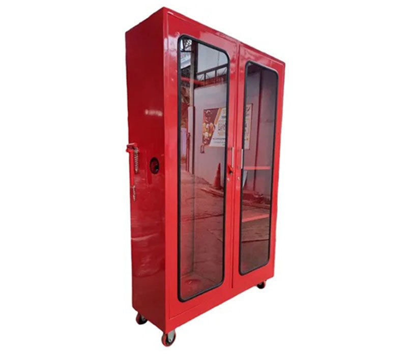 4. Dilengkapi 2 buah Pintu Kaca, 2 buah kunci, 2 buah handle, 4 buah roda double ball bearing Size: diameter 4 inch disertai fungsi rem yang di las ke rangka besi bawah